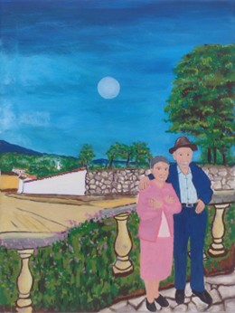El origen de esta obra es mi profundo deseo de inmortalizar la resiliencia de mis abuelos maternos Martín y Maruja. La escena de fondo corresponde a la cuadra de su casa en San José de Miranda, Santander (Colombia).