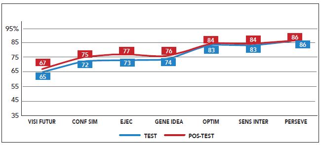 De este modo, surgen interpretaciones claves para este estudio, reconociendo en las competencias de habilidad (figura 3) fortalecimientos significativos en habilidades como ejecución, con un incremento del 6 %, confianza en sí mismo 5 % y visión de futuro 4 %. Adicionalmente, se observa un incremento del 4 % en sensibilidad interpersonal; por su parte, la competencia generación de ideas aumento en un 3 %, lo cual puede indicar fortalecimiento del pensamiento lateral, flexible y creativo, así como mayor iniciativa hacia la innovación.