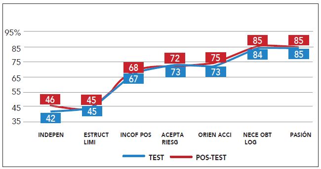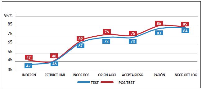 Las figuras 1 y 2 relacionan el promedio de los resultados obtenidos en la aplicación del test y pos-test al total de la muestra retomada para este estudio (177 emprendedores), clasificando los resultados en competencias de habilidad y competencias de personalidad. De este modo, en la figura 1 se observa un incremento en el pos-test en 6 de las 7 competencias evaluadas, reconociendo un crecimiento significativo en las competencias confianza en sí mismo y ejecución, con un aumento del 3 y 4 % respectivamente. A su vez, se reconoce un fortalecimiento del 2 % en las competencias visión de futuro y generación de ideas; en la figura 2 surgen variaciones en las dimensiones de personalidad evaluadas.