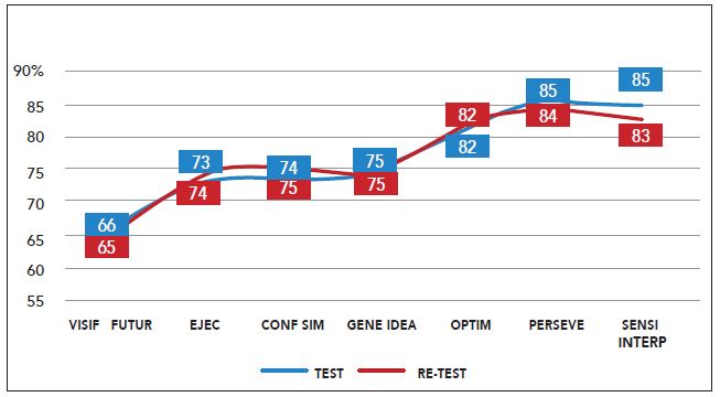 Las figuras 5 y 6 indican el promedio de desarrollo de las competencias de habilidad y personalidad evaluadas en los 88 emprendedores pertenecientes al grupo control del Creactivate 4.0. Los resultados comparativos del test versus el pos-test del EMP para el grupo de control, reflejan una dinámica diferente a la del grupo muestra; de este modo, la figura 5, que ilustra los resultados de las competencias de habilidad, refleja incrementos máximos del 1 % al comparar el test con el pos-test y disminuciones en los niveles de desarrollo del pos-test de hasta el 2 %. Situación que no se presentó en el grupo de muestra donde no surgieron disminuciones, y los fortalecimientos fueron hasta del 6 %. Así pues, para el caso del grupo control, las competencias que más se fortalecieron fueron ejecución y confianza y seguridad en sí mismo, ambas con un fortalecimiento del 1 %. Por su parte, la visión de futuro, y perseverancia disminuyeron en un 1 %; además se reconoce, una disminución del 2 % en sensibilidad interpersonal. Cabe mencionar que generación de ideas y optimismo continúan en el mismo nivel de desarrollo.