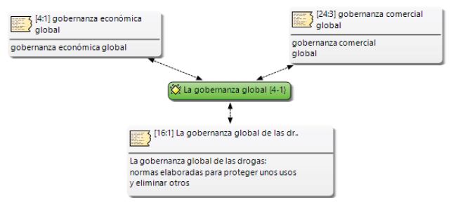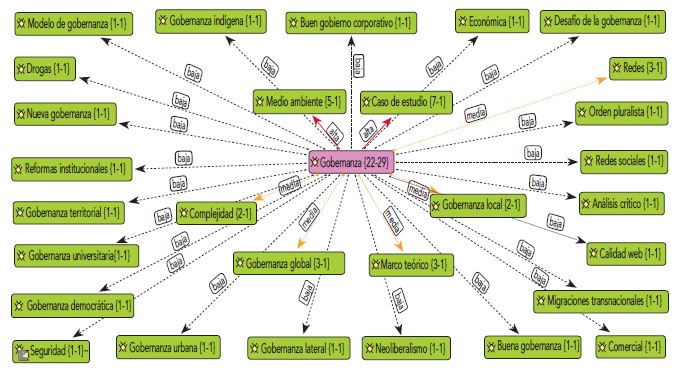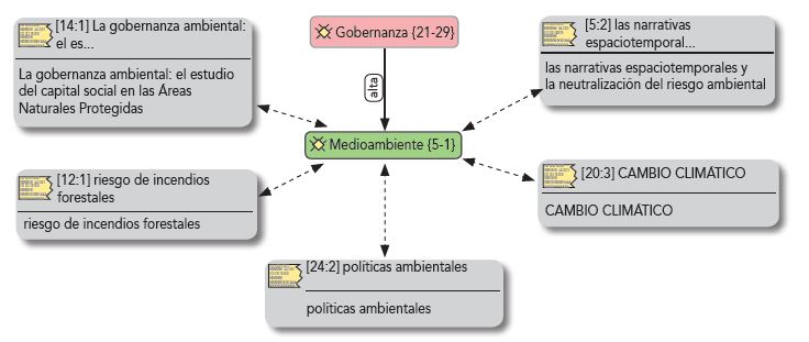 Es observable la dispersión temática que aborda la gobernanza y una tendencia predominante a utilizar sus argumentos como fundamento para analizar casos específicos. Es sorprendente los numerosos tipos de gobernanzas y campos de aplicación. Los dos temas más abordados son el medioambiente y la gobernanza global. A partir de lo anterior, por orden de cantidad de veces tratado el tema, se construyeron las redes representadas en las figuras 9, 10 y 11. Las figuras relacionan el tema con fragmentos que señalan el contenido o quotes en inglés.