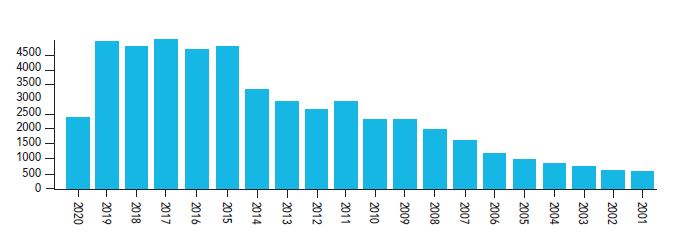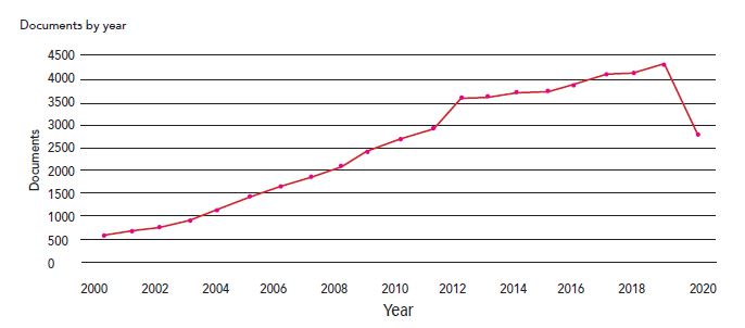 La figura 2 muestra la evolución, en función del tiempo, del número de contribuciones científicas publicadas en Scopus, mientras que la figura 3 muestra estos mismos parámetros, pero para la base de WoS. Se puede observar que el desempeño cuantitativo de las publicaciones en esta área del conocimiento es muy similar, esto se debe a que la mayoría de las editoriales que publican investigaciones sobre el tema están registradas en ambas bases de datos.