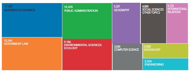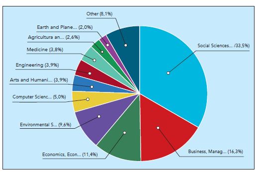 Las figuras 4y5 muestran la distribución de las contribuciones científicas por especialidades. Scopus la muestra en valores porcentuales, mientras que WoS indica las cantidades de contribuciones. Es visible el uso extendido del término gobernanza en las áreas de investigación referidas por Scopus, esencialmente en las de ciencias sociales, los negocios y la economía, aspecto lógico si se considera el campo de acción de la gobernanza. En WoS es notable además de la presencia de las áreas tradicionales de dominio de la gobernanza como administración pública y su su aplicación en temas ambientales como servicios ambientales-ecológicos.
