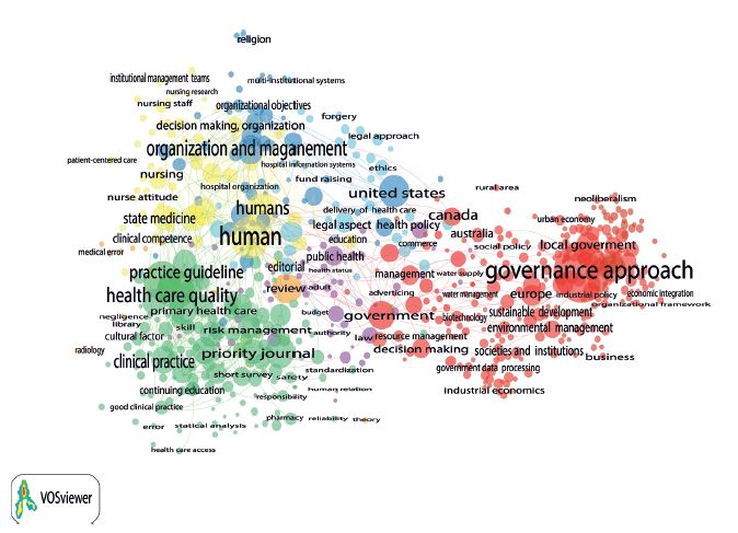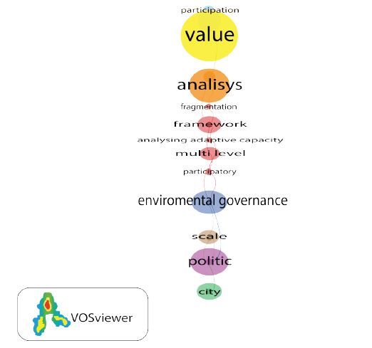 La figura 6 muestra un mapa de densidad y correlación de términos mucho más completo que el mostrado en la figura 7. Esto se debe a que los metadatos de palabras claves en la base de datos de Scopus sobre gobernanza son mucho más detallados que los de la base de datos de WoS. Esta diferencia es notable cuando se quiere realizar trabajos de investigación relacionados con estados del arte, análisis bibliométricos y evolución cualitativa de una línea temática determinada. Lo que concluye la ventaja de utilizar Scopus para estos tipos de estudios. La densidad y correlación de términos para ambas figuras infiere un abordaje de la gobernanza, no solo en su campo tradicional de la actividad pública, sino un avance hacia otras áreas del conocimiento, lo que valida lo expresado anteriormente sobre su uso extendido. Estas evidencias demuestran la solidez de la teoría de la gobernanza en las ciencias sociales.