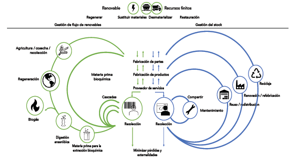 El objetivo de la EC no es el de reducir la producción ni la limitación en la generación de riqueza; al contrario, lo que busca es una optimización de los recursos, respetando las relaciones naturales, y que se traduzca no solo en la preservación de la riqueza, sino en la creación de más valor dentro del ciclo productivo. Ellen MacArthur Foundation (2015) propone un marco de implementación de este modelo que se muestra en la figura 1. Este marco se basa en tres conceptos, distinguiendo entre ciclos técnicos y biológicos, y que se puede aplicar a cualquier escala.