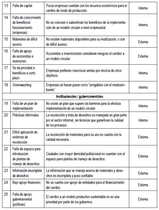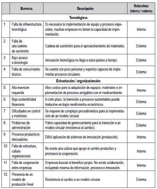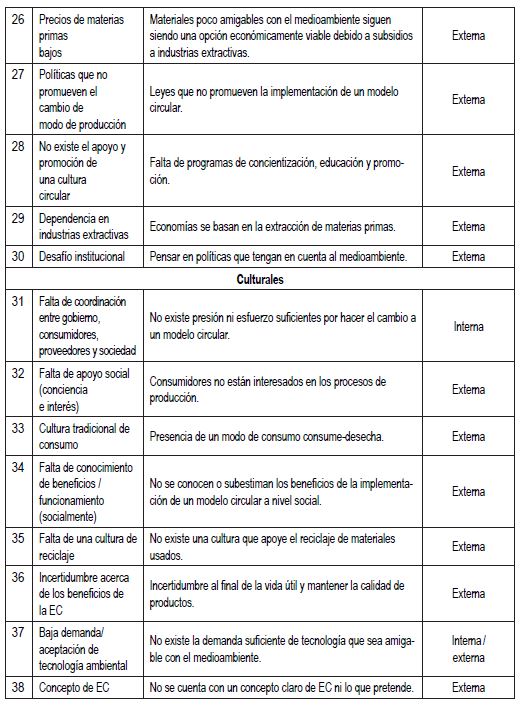 En la tabla 1 se plasman los resultados de la revisión sistemática de la literatura. Se encontraron 38 barreras que impiden la implementación del modelo circular en economías en vías de desarrollo. Se clasificaron las barreras en cuatro categorías: tecnológicas, estructurales, institucionales y culturales. Cada barrera cuenta con su descripción, significado y lo que implica dentro del proceso de aplicación de la EC. Las barreras pueden ser de naturaleza interna, es decir, que se originan dentro del sistema en sí, o externa, que se da gracias a factores externos a la economía o la empresa.