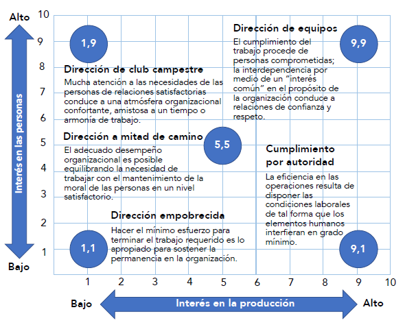 El director 1,1 (dirección empobrecida), quien exhibe mínimo interés tanto en la producción como en las personas; el 9,1 (cumplimiento por autoridad), quien se interesa mucho en la producción pero exhibe poco interés en los individuos; el 1,9 (dirección de club campestre), quien tiene los intereses exactamente contrarios a los del director 9,1; el 5,5 (dirección a mitad de camino), quien mantiene un interés adecuado tanto en las personas como en la producción, y el 9,9 (dirección de equipos), que exhibe máximo interés tanto en los individuos como en la producción.