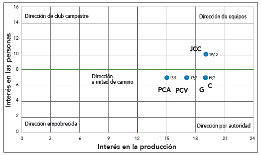Los cargos de gerente y contador se perfilan hacia la dirección por autoridad. Este perfil se caracteriza por centrar su gestión en la realización de las tareas antes que en las personas. Borja (2014) revela que este tipo de liderazgo conlleva a una situación de obediencia por parte de los subordinados que a su vez son tratados como los instrumentos a través de los cuales se concretan los fines organizacionales en un marco estructural rígido. El mismo autor reconoce que este estilo está ligado a la alta productividad a costa de la afectación que sufren la motivación y la creatividad junto a un aumento de conflictos al interior del grupo. Autores como Enríquez (2017) y Zuzama (2015) coinciden en que los líderes más efectivos tienen alta preocupación por la gente y la producción; son los que ejercen una dirección de equipos. También se identificó que el 100 % los cargos muestran interés por la producción y el 80 % dan una mediana atención a las personas.