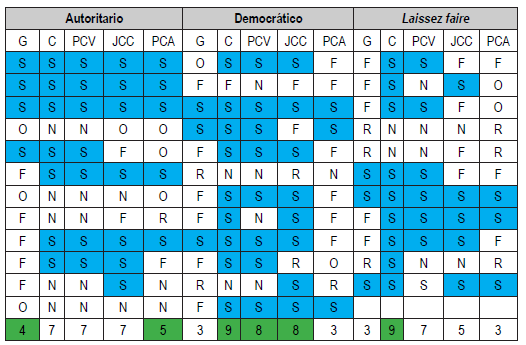 A continuación, se procedió a cuantificar según la clasificación de los estilos de Lewin en aquellos cargos de la cooperativa que dieron las respuestas más altas a los ítems, esto es la S de Siempre (tabla 2). Se identifica que el estilo laissez faire no está presente en la organización; por otra parte, la gerencia y la presidencia del Consejo de Administración encajaron en el estilo autoritario (caracterizado por la toma de decisiones en manos del líder y la ejecución a cargo de sus colaboradores), y el estilo que prevalece es el democrático, ejercido por los cargos de contador, presidente del Consejo de Vigilancia y jefe de Crédito y Cobranzas. Es importante señalar que el estilo sobresaliente se compagina con el tipo de organización estudiada, dado que el segundo principio universal del cooperativismo demanda el control democrático de los miembros, para tal efecto la gestión debe ser participativa y la toma de decisiones por la vía democrática, sentando las bases del cuarto principio universal (autonomía e independencia), ya que ante cualquier acuerdo con otras organizaciones los directivos velarán por que los miembros mantengan el control democrático y se asegure la autonomía de la cooperativa.
