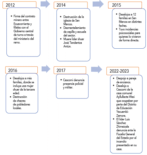 La figura 1 permite visibilizar y contextualizar aquellas incidencias que han emergido con mayor intensidad a través de afectaciones como es el derrocamiento de la iglesia y los desalojos forzosos en la zona de San Marcos bajo la figura legal de servidumbres mineras conforme la Ley de Minería (EC 2012), lo que lleva a repensar en las afectaciones que se desencadenaron por cuestiones territoriales para ampliar el área de concesión de la empresa minera.