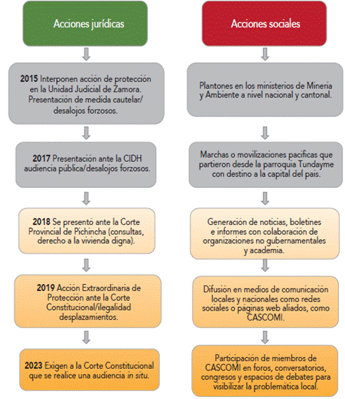 Las entrevistas fueron enfocadas a quienes presentaron acciones jurídicas para identificar y conocer a profundidad su argumentación como los factores para asumir esa posición. Paralelamente, se realizó una revisión documental judicial sobre las acciones presentadas por parte de CASCOMI como propulsor principal, las que corresponden a distintos niveles judiciales en orden cronológico acompañados de la asesoría o patrocinio legal de organizaciones como INREDH o CEDHU. En 2015 se presentó una medida cautelar por desalojos forzosos efectuados en los años 2015 y 2016 en la Unidad Judicial Penal de Zamora; así también, la Defensoría del Pueblo abrió dos expedientes defensoriales como parte de su competencia. De igual forma, en 2017, en una presentación ante la CIDH en audiencia pública se trató sobre el mismo tema al no tener una respuesta favorable en el marco nacional. También, en 2018, ante la Corte Provincial de Pichincha se destaca como derechos fundamentales la consulta previa, libre e informada y el derecho a la vivienda digna. En 2019 se presentó una acción extraordinaria de protección ante la Corte Constitucional del Ecuador con relación a la ilegalidad de los desplazamientos ejecutados por la institución competente del momento, como es la Agencia Regional de Control Minero (ARCOM). Y, la más reciente es en 2023, cuando los accionantes solicitan que se efectúe una audiencia in situ a la Corte Constitucional como máximo órgano con el propósito de que las víctimas o personas afectadas sean escuchadas directamente.