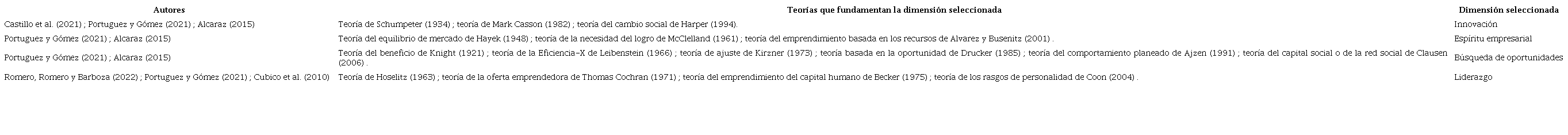 La selección de las dimensiones en la tabla 1 se fundamenta en diversas teorías que exploran el rol y las características del emprendedor a lo largo del tiempo. Knight (1921) expuso la noción de que el emprendedor asume riesgos y enfrenta la incertidumbre, mientras que Schumpeter (1934) destacó su capacidad para resolver problemas. Hayek (1948) abogó por un espíritu empresarial que incluye planificación, toma de decisiones y programación. McClelland (1961) sugirió que los emprendedores poseen una necesidad inherente de éxito, mientras que Hoselitz (1963) subrayó la importancia del liderazgo y las habilidades gerenciales. Leibenstein (1966) argumentó que la ineficiencia empresarial genera oportunidades para los emprendedores, y Cochran (1971) relacionó el carácter emprendedor con factores culturales y de crianza. Kirzner (1973) afirmó que los emprendedores identifican y aprovechan las oportunidades de ganancia para equilibrar el mercado. Becker (1975) postuló que el conocimiento adquirido a través de la educación y la experiencia es vital para los emprendedores, mientras que Casson (1982) enfatizó la importancia de la imaginación. Drucker (1985) sugirió que los emprendedores explotan oportunidades creadas por ellos mismos, Ajzen (1991) señaló que la conducta emprendedora se encuentra supeditada por las intenciones o motivaciones, y Hamilton y Harper (1994) destacaron la creatividad como un motor de transformación social y crecimiento económico. Alvarez y Busenitz (2001) argumentaron que el acceso a recursos predice el emprendimiento basado en oportunidades, mientras que Coon (2004) relacionó el emprendimiento con rasgos de liderazgo y Clausen (2006) postuló que la integración en redes sociales amplias proporciona oportunidades significativas (Terán y Guerrero 2020).