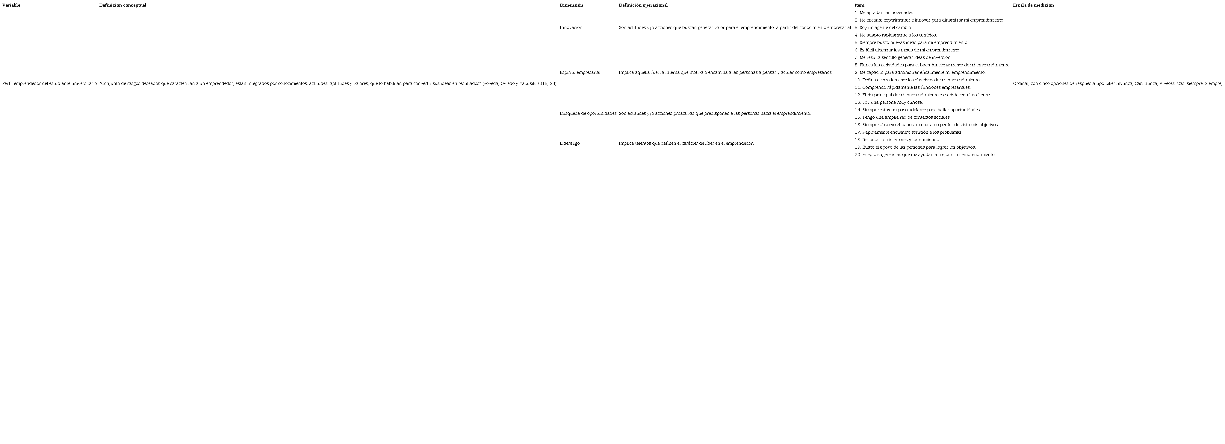 Con base en las dimensiones seleccionadas, se procedió a desarrollar los reactivos correspondientes a estas dimensiones. Este proceso implicó la operacionalización de la variable, como se detalla en la tabla 2, que presenta el constructo del perfil emprendedor del estudiante universitario, el cual se compone de cuatro dimensiones: innovación (con cinco reactivos), espíritu empresarial (con siete reactivos), búsqueda de oportunidades (con cuatro reactivos) y liderazgo (con cuatro reactivos), que da un total de 20 reactivos o ítems en el instrumento. Se utilizó una escala tipo Likert de cinco puntos para recoger las respuestas, considerando que la variable es de tipo ordinal. Cada respuesta se ha valorado en una escala del 1 (nunca) al 5 (siempre) para permitir una evaluación precisa, posibilitando el procesamiento de los datos de forma cuantitativa.