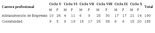 La población estudiada comprendió a los estudiantes de las carreras de AE (1200 estudiantes) y Contabilidad (1100 estudiantes, para fines comparativos) en una universidad privada en Perú. La única restricción para acceder a la muestra fue que los estudiantes participantes estuvieran inscritos entre el quinto y décimo ciclo académico, lo que limitó la población objetivo a 750 estudiantes de AE y 700 estudiantes de Contabilidad.
