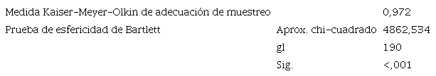 Con el propósito de garantizar la coherencia y consistencia de los resultados en alineación con el objetivo general de este estudio, se llevó a cabo un análisis factorial exploratorio para evaluar el instrumento utilizado en la medición de la variable de interés. Los resultados de la prueba de Kaiser-Meyer-Olkin (KMO) y la prueba de Bartlett, aplicadas al instrumento que mide el perfil emprendedor del estudiante de AE, se detallan en la tabla 4. En este contexto, la medida de adecuación de muestreo de Kaiser-Meyer-Olkin superó el umbral de 0,90 (KMO = 0,972), validando así el número de componentes principales o factores que constituirían la variable compleja (Cerny y Kaiser 1977). En cuanto a la prueba de esfericidad de Bartlett, el valor hallado (p-valor < 0,001 es < 0,05) apunta a la existencia de correlaciones estadísticamente significativas entre los reactivos de cada instrumento, evidenciando asociaciones notables entre los ítems. Además, se deduce que la matriz de covarianza no se asemeja a la matriz de identidad en cada instancia (Rossi y Rossi 2022).