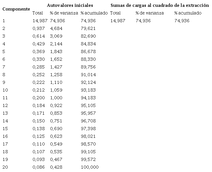Para evaluar y confirmar el número de factores que delinean las dimensiones del constructo perfil emprendedor del estudiante de AE, se elaboró la varianza total explicada, cuyos resultados se detallan en la tabla 5. Al analizar dicha tabla, se evidencia que el número óptimo de factores es uno, indicando así que, en el contexto específico de esta investigación, la variable subyacente es unidimensional. Este hallazgo sugiere que un solo factor es suficiente para capturar el 74,936 % de la variabilidad presente en el perfil emprendedor del estudiante de AE, subrayándose así la robustez y la relevancia de dicha dimensión en el marco conceptual del presente estudio.