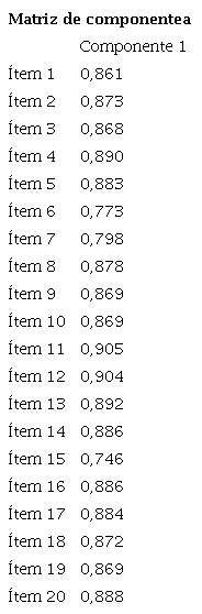 Las tablas 5 y 6 revelan que la variable perfil emprendedor del estudiante de AE presenta un constructo unidimensional al contener únicamente un componente o factor. En consecuencia, la solución no es susceptible de rotación, reflejando así la naturaleza unidimensional del constructo, que se puede interpretar como un constructo muy sólido constituido por 20 reactivos con una alta carga factorial. Cuando todos los ítems de un instrumento obtienen una alta carga factorial, significa que todos ellos están muy relacionados con el constructo que se está midiendo. En otras palabras, cada ítem del instrumento contribuye significativamente a medir la misma característica o concepto subyacente. Esto es positivo desde el punto de vista de la validez del instrumento, ya que indica que todas las proposiciones incluidas están efectivamente capturando el fenómeno que se quiere evaluar. Por lo tanto, proporciona una evidencia sólida de que el instrumento es coherente y confiable para medir el constructo en cuestión.