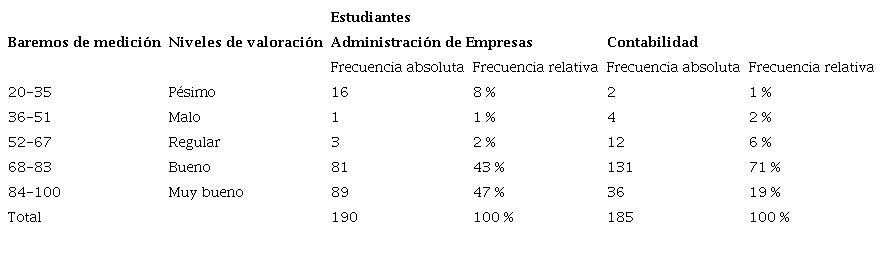 Además, se llevó a cabo una evaluación de la confiabilidad del instrumento mediante el coeficiente alfa de Cronbach. En este estudio, el valor obtenido fue de α = 0,982, lo que indica una confiabilidad notable del instrumento; posteriormente, se procedió a medir el nivel del perfil emprendedor en los estudiantes de AE y Contabilidad. Los resultados de esta medición se presentan en la tabla 7.