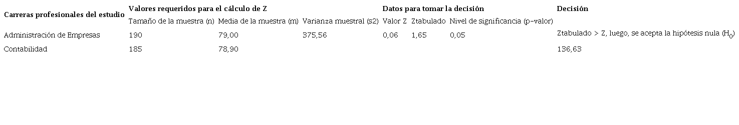 Para comprobar las hipótesis de trabajo se utilizó el estadístico Z, que es una medida utilizada en estadística inferencial para determinar si hay una diferencia significativa entre las medias de dos poblaciones. Este estadístico se calcula cuando se tienen dos muestras independientes y se desea comparar la media de una variable entre ambos grupos. La fórmula empleada se muestra a continuación: