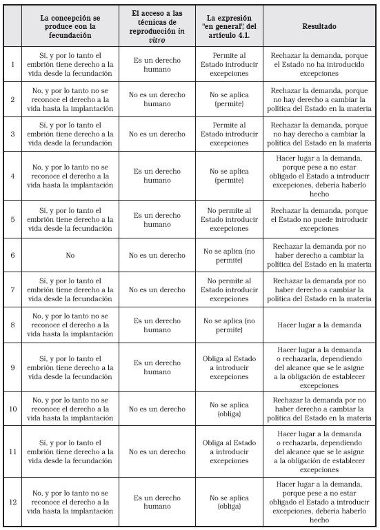 Observemos el cuadro precedente. Las hipótesis 4, 8 y 12 son prácticamente idénticas, con una leve diferencia. Al identificarse la concepción con la implantación, el embrión no implantado no tiene derecho a la vida, y por tanto resulta abstracto preguntarse si el Estado podía, tenía prohibido o estaba obligado a introducir las excepciones a las que se alude en el artículo 4.1 de la Convención. Al no existir en esta alternativa un derecho en cabeza del embrión y sí existir un derecho en cabeza de quienes deseaban acceder a las técnicas de reproducción asistida, el Estado debía garantizar este derecho y, por lo tanto, estaba obligado a hacer lugar a lo que se demandó. También conducían al mismo resultado las hipótesis 9 y 11. En la primera, el embrión tiene derecho a la vida desde la concepción que se produce con la fecundación, pero los peticionantes tienen derecho a acceder a las técnicas de reproducción asistida y el Estado está obligado a introducir excepciones al artículo 4.1 de la Convención. En la segunda, el embrión tiene derecho a la vida, los peticionantes no tienen derecho a las técnicas, y el Estado está obligado a introducir excepciones al artículo 4.1. Situados en una u otra opción, el resultado de la demanda dependía de qué tan amplia fuera la obligación del Estado de introducir excepciones a lo establecido en el artículo 4.1. Si la obligación abarcase el admitir como excepción que alguien pudiera realizar técnicas de reproducción asistida, entonces habría que haber hecho lugar a la demanda. En el primer caso, tal extensión sería menos difícil de justificar que en el segundo, puesto que se habría reconocido antes la existencia de un "derecho" a las técnicas de reproducción.
