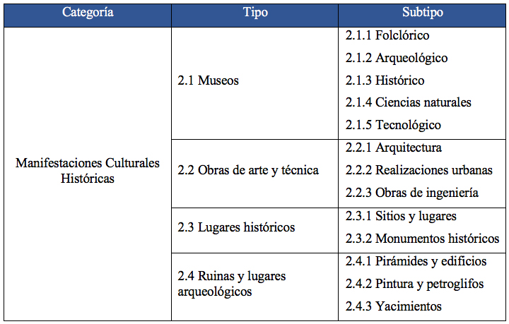 En la categoría 2, “Museos y manifestaciones culturales históricas del tipo 2.4. lugares históricos”, se refiere a aquellos sitios cuyo valor reside únicamente en estar asociados a algún acontecimiento relevante de la historia nacional o local, sin necesitar dicho sitio tener un valor intrínseco, en cambio los otros tipos y subtipos sin perjuicio de la virtud antes señalada, se consideran en función de sus cualidades propias. El subtipo 2.2.5. “Realizaciones urbanas”, comprenden a todas las ciudades, pueblos o barrios edificados con sistemas o estilos que no tienen aplicación desde largo tiempo atrás (cuadro 1).