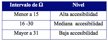 Posteriormente, se obtiene el índice Shimbel (Ω) que constituye la suma de las distancias topológicas entre cada vértice y todos los demás, entonces para estimar la accesibilidad general del área de estudio es necesario tener el índice de dispersión (G) que es la sumatoria de los índices Shimbel, el cual representa el número total de aristas o arcos que se deberían recorrer desde cada nodo a todos los demás, por el camino más corto. De esta forma, para conocer la accesibilidad media de los centros poblados en la subregión Barlovento, resulta de dividir el índice de dispersión y el número de nodos, para luego compararlo con el índice Shimbel (Ω) de cada nodo o poblado, estableciéndose un intervalo en función al valor mínimo y máximo del índice Shimbel para mostrar los niveles de accesibilidad (cuadro 4).