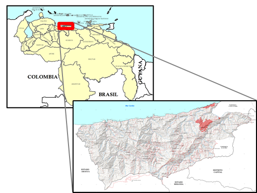 El área de estudio corresponde con la parroquia Carayaca del estado Vargas, está en la vertiente norte de la Serranía del Litoral (figura 1). Se ubica entre las coordenadas UTM- 673.736,216 y 716.935,794 m E y 1 162.643,294 y 1.166.320,891 m N. Carayaca es la parroquia más grande del estado Vargas posee una superficie de 47.691 ha, y representa el 31,9 % del área de la entidad. Limita por el norte con el Mar Caribe, por el sur con el Distrito Capital y estado Aragua, por el este con la parroquia Catia La Mar y Distrito Capital y por el oeste con el estado Aragua.