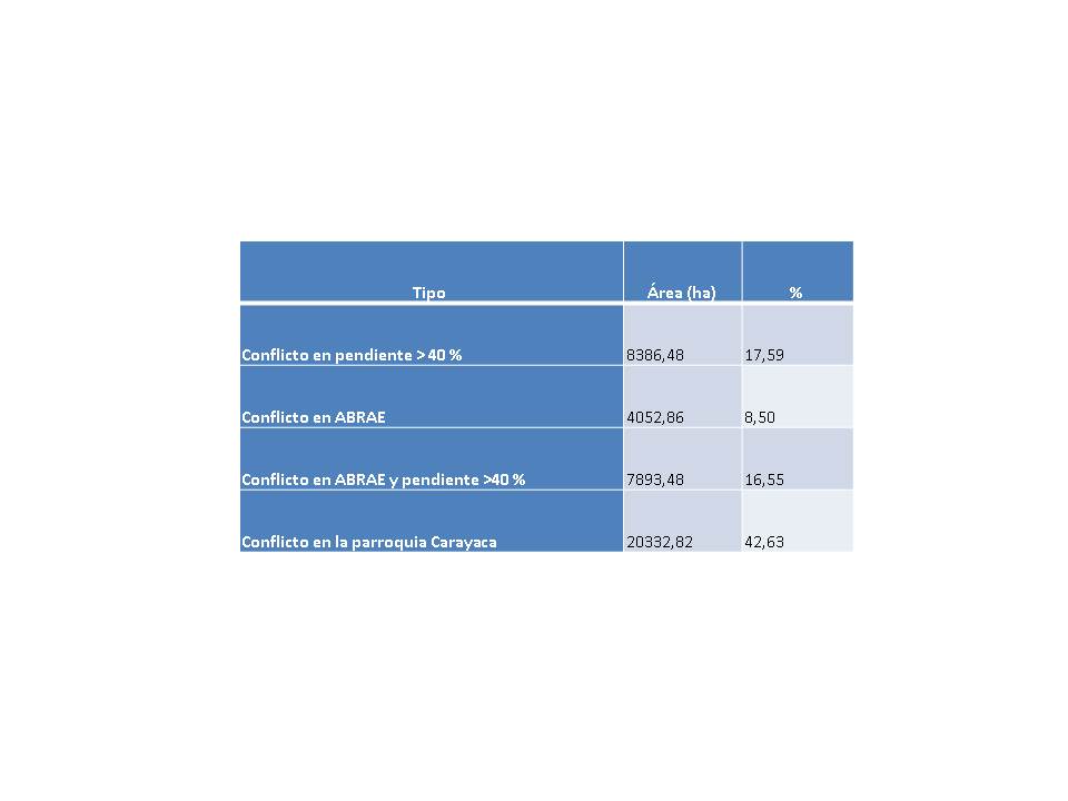 De igual manera, considerando la importancia de las ABRAE en la parroquia, que ocupan aproximadamente 61 % de la superficie, de las cuales 25 % fueron determinadas en la presente investigación como áreas de conflicto, en otras palabras el 41,1 % de las unidades poseen conflicto. El área identificada con conflicto tanto por pendiente como por ABRAE ocupa el 17 % de la parroquia.