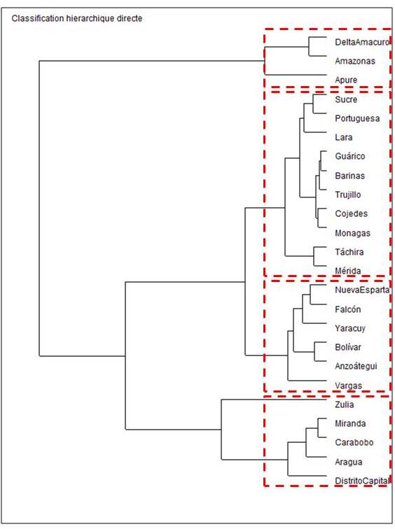 Los grupos resultantes del dendograma conducen a dos conclusiones, primero existe una clara dicotomía entre entidades federales tradicionalmente pobres o de baja condición socioeconómica, como Delta Amacuro, Amazonas y Apure, y entidades federales de mayor desarrollo económico como Distrito Capital, Zulia, Miranda y Carabobo; el segundo aspecto a destacar es que parece existir una alta homogeneidad entre la mayor parte de las entidades federales con base en su condición socioeconómica, dado que los grupos II y III combinados suman 16 individuos, lo que sugiere de acuerdo a nivel social y económico la mayor parte de las entidades federales venezolanas son muy similares.
