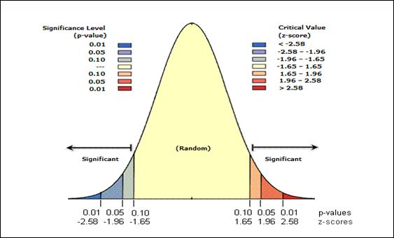 Los niveles de confianza típicos van marcados de un 90, 95 y 99 % (ESRI. ArcGis for Desktop. Herramienta de análisis estadístico) un nivel de confianza del 99 % sería el punto más vulnerable, debido a que se encuentra dentro de un valor extremo correspondiendo que la probabilidad de esos hechos ocurrieron por un factor y elemento espacial en particular.