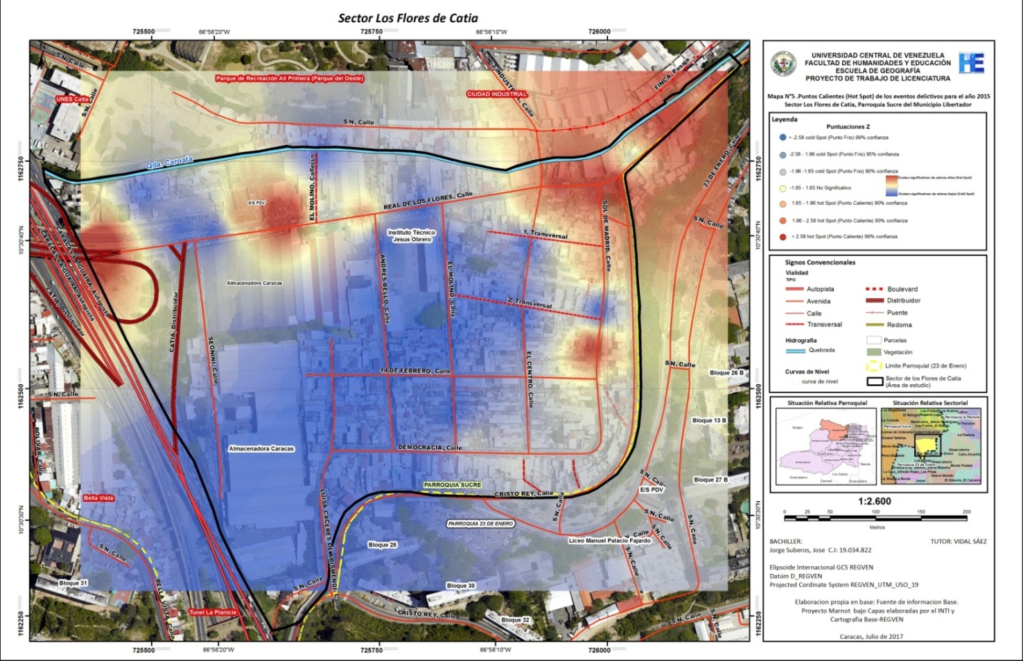 Finalmente, el objetivo del trabajo es caracterizar los eventos delictivos formalmente denunciados para el año 2015, según el Cuerpo de Investigaciones Científicas Penales y Criminalísticas (CICPC) y la Policía Nacional Bolivariana (PNB) en el sector de Los Flores de Catia, parroquia Sucre del municipio Libertador, a través de un Sistema de Información Geográfica (SIG) y un respectivo modelo estadístico que medirá la autocorrelación de cada uno de los puntos donde ocurrieron los delitos, llamado “Autocorrelación Espacial Incremental” y los “Hot Spot”.