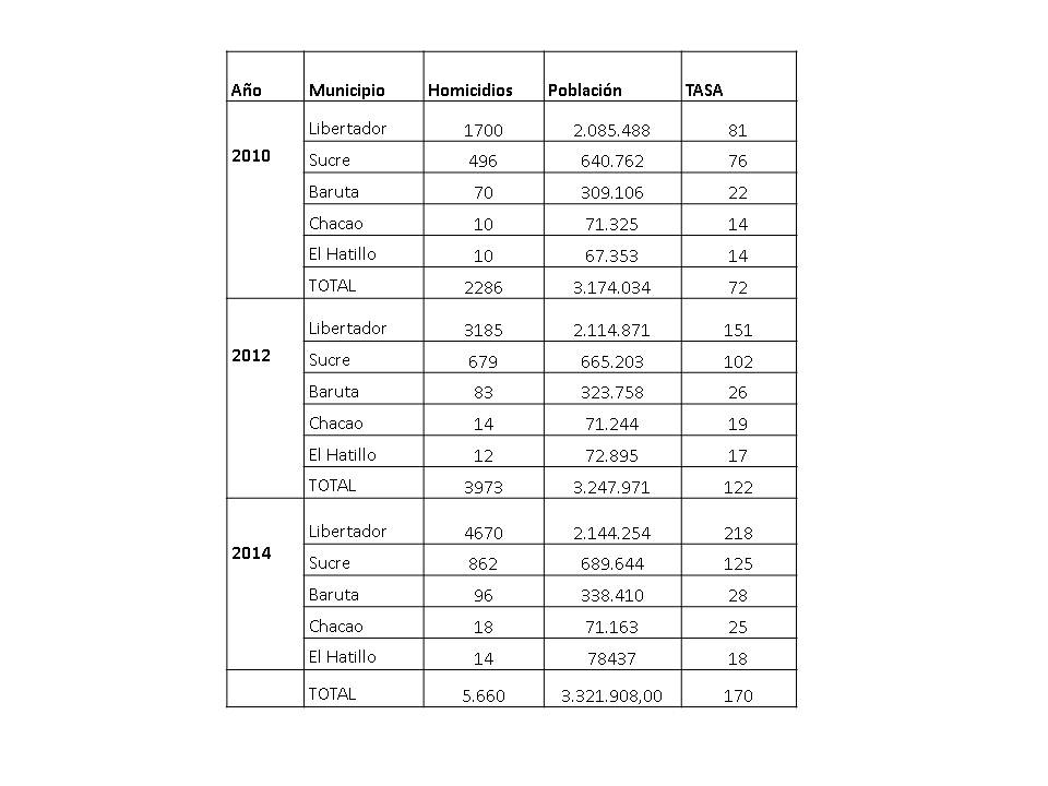 Como se puede apreciar en el cuadro 1, se tiene además, que en el Área Metropolitana de Caracas (AMC) el municipio Libertador reportó el mayor número de homicidios en los años comprendidos entre el 2010 y el 2014; representó para el año 2010 un 74 % del total de homicidios con respecto a los demás municipios que conforman el AMC, 80 % para el año 2012 y un 83 % para el 2014. Tendencia que va en aumento y que se agrava cada día en los sectores populares que conforman el municipio Libertador entre ellos Los Flores de Catia.