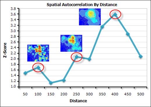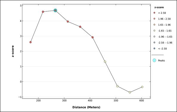 “El método de autocorrelación espacial incremental mide la correlación espacial de una serie de distancias y, de manera opcional, crea un gráfico de línea de esas distancias y sus correspondientes puntuaciones z”. Según Esri ArcGIS for Desktop. Las puntuaciones z reflejan la intensidad del clustering espacial y las puntuaciones z pico estadísticamente significativas indican las distancias donde los procesos espaciales que promueven el clustering son más marcadas (en la figura 2 se remarcan con un circulo). En tal sentido, mientras menor sea la distancia entre los puntos de variables específicas o comunes, estas tendrán mayor significancia o valores altos. Se puede decir que existe mayor homogeneidad de los datos espaciales entre estos puntos de distancias próximas con respecto a las de mayor distancia. Áreas donde se concentra las tonalidades (rojas) indican mayor proximidad de los eventos ilícitos, uno respecto al otro y así sucesivamente con su vecino más cercano (figura 2).
