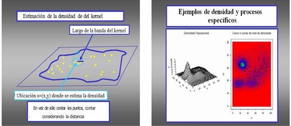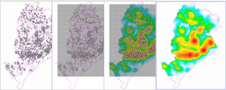 El método más consagrado para identificar hot spots es la estimación de densidad de Kernel, cuyo resultado son los mapas de Kernel (Esri 2017). El método de interpolación permite estimar la densidad de puntos por medio del método de suavización de densidad de Kernel, son colocados sobre cada punto, a partir de un grid de células (una cuadricula) que cubrirá el espacio analizado. La distancia entre cada célula y cada punto es evaluada por una función de Kernel (figura 3). En el caso específico, se utiliza la función normal, cuyo tamaño del radio de interpolación fue definido en función de la especificidad de cada crimen o del área en estudio. Luego se suma cada estimación individual de Kernel para producir una estimación general de densidad para esta célula.