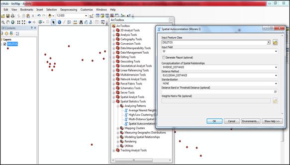 Para la aplicación del modelo a través de la herramienta de ArcMap 10.1 de ArcGis, se utilizó como variable los tipos de delitos previamente georreferenciados (capa o Shapefile formato de edición del punto de entrada), luego en el módulo de herramientas del SIG correspondiente a la carpeta de herramientas de estadística espacial - análisis de patrones y Autocorrelación Espacial (figura 5), que a continuación se explicará, la debida secuencia para el respectivo resultado.
