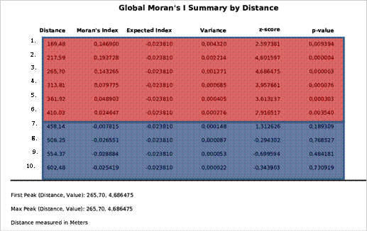 Cada pico o punto representa una distancia donde se marcan los procesos que promocionan el clustering espacial. Los picos múltiples son comunes. Por lo general, los picos asociados con distancias más pequeñas reflejan amplias tendencias (una amplia tendencia de este a oeste que recorre toda la calle Real de Los Flores en sus extremos superiores, por ejemplo, donde el extremo superior Oeste (desde la redoma Sol de Madrid hasta la intersección con la avenida Sucre es un área caliente gigante), y el extremo superior Este (elevado de los Flores con intersección a la autopista Caracas-La Guaira) es otra área caliente.