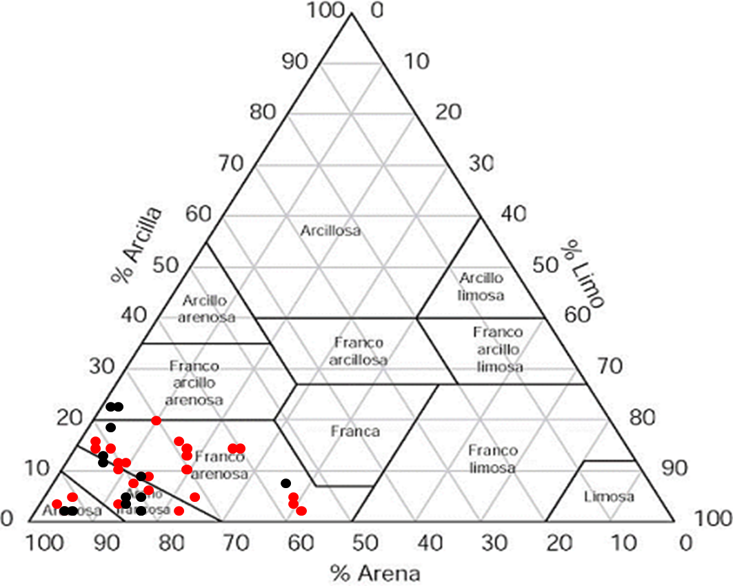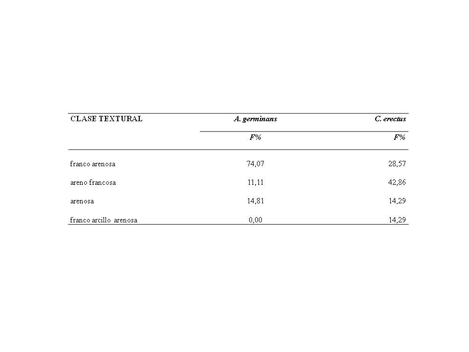 Las especies en estudio se ubican en un variado espectro textural del suelo, fundamentalmente entre las clases: arenosa, areno francosa, franco arenosa y franco arcillo arenosa (figura 3).
