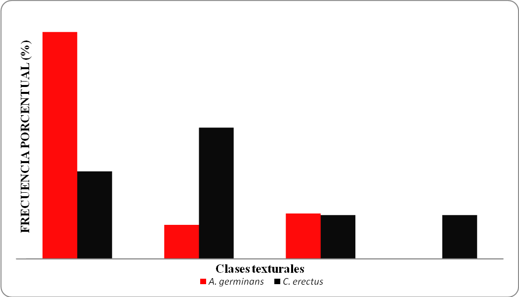 En cuanto a la vinculación con la textura del suelo que sirve de sustrato, ambas especies crecen en un área con un alto contenido de partículas arena en su composición. Aun cuando los individuos de A. germinans se desarrollan fundamentalmente sobre condiciones franco arenosas, mientras que el C. erectus se asoció mayoritariamente a una superficie en donde se incrementa levemente la fracción arenosa, clasificando en la clase textural areno francosa.