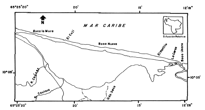 La laguna de Unare es un humedal ubicado entre los 10°04'–10°08'N y 65°12' - 65°25'O, en el estado Anzoátegui de Venezuela. Colinda al norte con el Mar Caribe y por el sur con una planicie y una serie de colinas relativamente bajas, cuya altura máxima es de 600 metros, denominada cerro El Morro (Roa, 1990), mientras que al este tiene como límite el rio Unare y al oeste Boca de Uchire (figura 2).