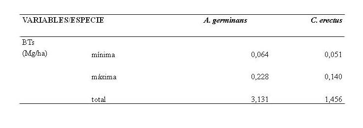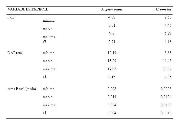 En el cuadro 1 se presentan los resultados obtenidos para las variables: altura (h), DAP, AB y BTs, para el grupo de individuos que constituyen las especies A. germinans y C. erectus.