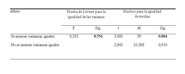 Al comparar la varianza correspondiente a la varible altura en ambos grupos de muestras, se obtuvo que la prueba de Levene arrojó 0,556, un valor muy superior al límite de 0,005. Por lo que se asume que la varianza de error para ambos grupos es igual. En tal sentido, se consideró la significancia de la prueba t correspondiente, la cual presentó un valor de 0,004, por lo que se puede afirmar que existen diferencias significativas entre las alturas medidas para A. germinas y C. erectus. Presentando la primera de estas especies una mayor dominancia (cuadro 2).