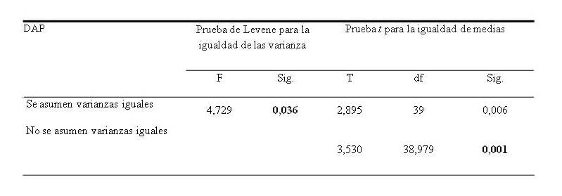 Sin embargo, presenta valores significativamente superiores a los registrados para el C. erectus en la localidad en estudio. En efecto, para esta última especie se estimó que el DAP varía entre 8,63 y 13,02 cm, para un promedio estimado de 11,48 cm ± 1,05 (cuadro 1). La prueba de Levene presento un valor de significancia de 0,036 por lo que se asumió varianza no iguales entre ambos grupos muestrales. La prueba t presentó una significancia de 0,001 por lo que se asume que el DAP es significativamente mayor en las A. germinans en comparación con los valores registrados para el C. erectus (cuadro 3).