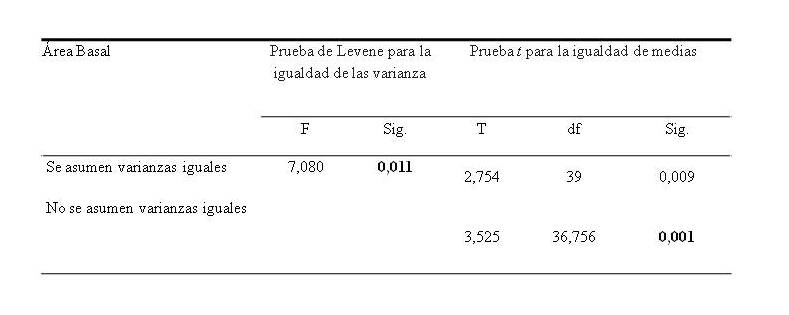 Los mayores valores de área basal (AB) se obtuvieron para las plantas de A. germinans, los cuales varía entre 0,008 y 0,024 m2/ha, para una media estimada de 0,014 m2/ha ± 0,004, en contraste con los registrados para los individuos de C. erectus que se ubicarón entre 0,005 y 0,013 m2/ha, con un promedio de 0,010 ± 0,001. La prueba de Levene presentó un valor de significancia de 0,011, por lo que se asumió varianzas no iguales entre ambos grupos muestrales. La prueba t presentó una significancia de 0,001 por lo que se asume que el AB es significativamente mayor en las plantas de A. germinans en comparación con los valores registrados para la especie C. erectus (cuadro 4).