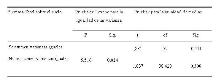 La biomasa aérea resultó similar para ambas especies (cuadro 5): (a) En el caso específico de las plantas de A. germinans, se estimaron valores entre 0,064 y 0,228 Mg/ha, para un total estimado de 3,13 Mg/ha, y (b) para los individuos de C. erectus, esta variable se ubicó en un rango entre 0,051 y 0,140 Mg/ha, con una total estimado de 1,456 Mg/ha. La prueba de Levene presentó un valor de significancia de 0,024 por lo que se asumió varianza no iguales entre ambos grupos muestrales. La prueba t presentó una significancia de 0,306 por lo que se consideró que no existen diferencias significativas entre los datos analizados para esta variable, siendo que la disponibilidad de BTs es análoga entre ambos grupos de especies (cuadro 6).