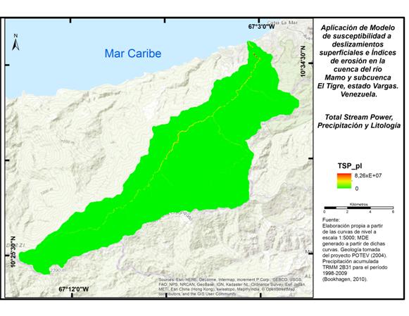 Para el cálculo de la erosión tomando en cuenta la precipitación y la litología se sigue la metodología empleada por Bustos (2016) quien la aplicó en otras regiones de Venezuela. El resultado del índice TSP pesado con precipitación y litología, se muestra en la figura 7. Se observan trazos de erosión en la parte media y baja de la cuenca, predominantemente en esta última. El índice TSP solo muestra erosión en el curso del rio principal de la cuenca (río Mamo).