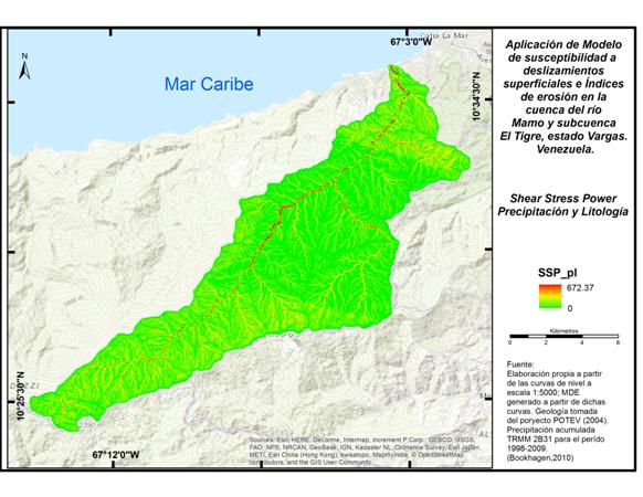 El resultado del índice SSP pesado con precipitación y litología, se muestra en la figura 9. Se detalla mucho mejor la erosión en el cauce principal; así como en algunas de las subcuencas (ej. El Tigre).