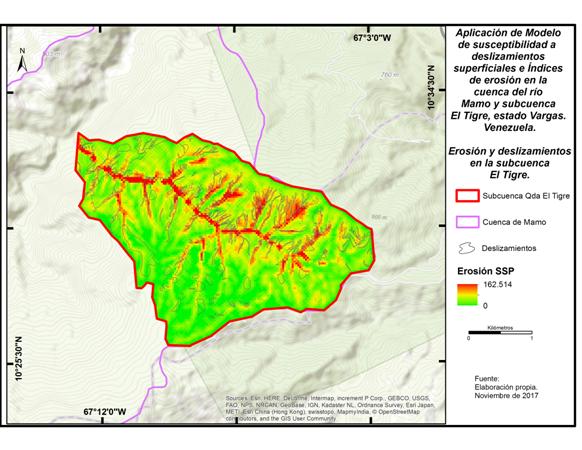 Para la subcuenca El Tigre, los valores más altos de erosión (índice SSP) tienden a localizarse en la franja de susceptibilidad donde se han concentrado históricamente los deslizamientos.