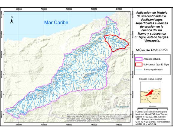El área de estudio limita al norte con el Mar Caribe, al sur con los estados Aragua y Miranda, al este con las cuencas de las quebradas La Zorra y Tacagua y al oeste con las cuencas del río Oricao y Chichiriviche. Comprende el municipio Vargas, parroquias Catia La Mar, Carayaca y El Junko del estado Vargas. La cuenca del río Mamo abarca una superficie de 144,6 Km². La misma pertenece a la Serranía del Litoral Central.