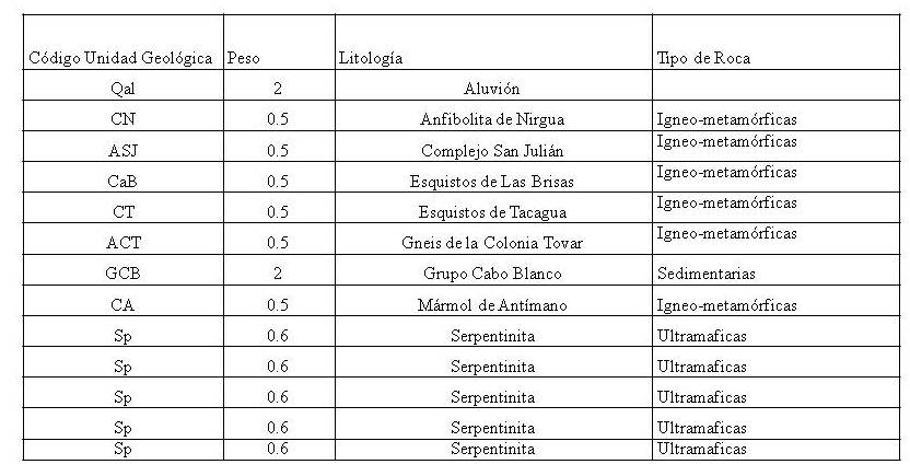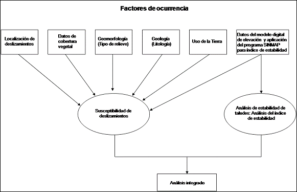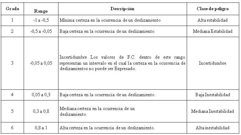 El modelo de susceptibilidad se hace combinando las siguientes coberturas: litología, geomorfología, pendiente, uso de la tierra y cobertura vegetal, mediante la aplicación de la función de probabilidad llamada Factor de Certeza (F.C.) (cuadro 1); calculado por las siguientes ecuaciones: