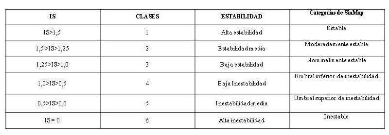 Este mapa empleado para calibrar el mapa de susceptibilidad genera el Factor de Seguridad (FS) que es el grado de estabilidad de laderas. Para este trabajo, se calculó de manera automática mediante el modelo SINMAP (Stability Index MAPing), el cual es un software estadístico-matemático para ArcGis, que produce el FS. El Modelo SINMAP (Pack et al., 2005) integra la computación y la ubicación geográfica del índice de estabilidad de taludes a partir del Modelo Digital de Elevación, “se basa en el Modelo de Estabilidad Infinita de Taludes” (Cereceda, 2006).